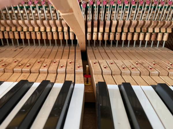 快適に弾けるようにするためには、調律師がこれらの部品の歪みを直し、膨張した部品も圧縮して、鍵盤を押し下げてハンマーが弦を叩くまでのブレーキを取り除き、且つロスなく正確に動くように調整する必要があります。