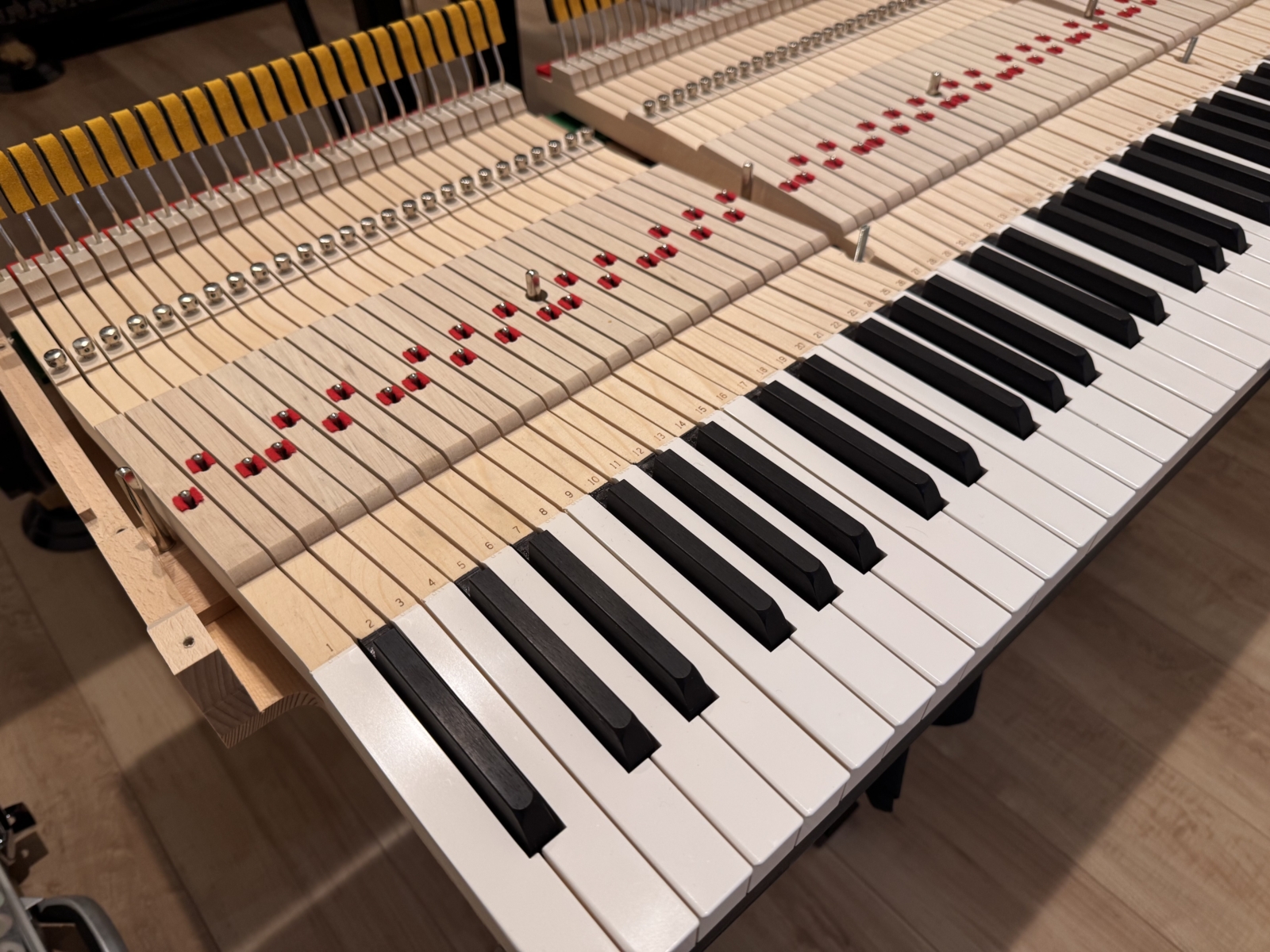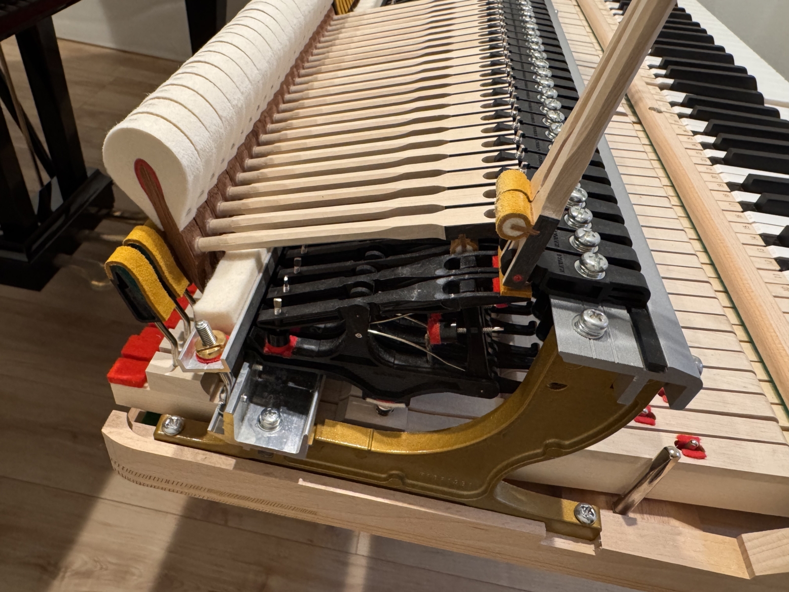 具体的には、部品同士の摩擦抵抗を極限まで減らし、鍵盤やアクションを正常な状態に調整(整調)します。かなり時間を要する作業ですが、ほとんどの方はここで満足される方が多く、更に軽くしたい場合は、鍵盤のウエイト調整に入ります。