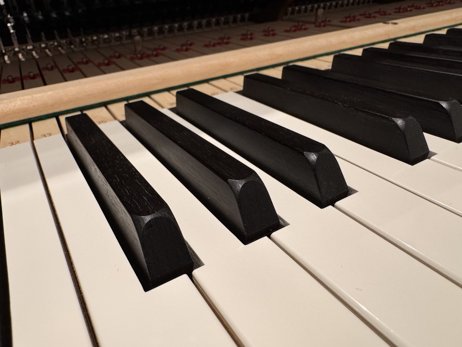 現在のカワイの鍵盤は、一昔前に比べて鍵盤が長く設計されています。